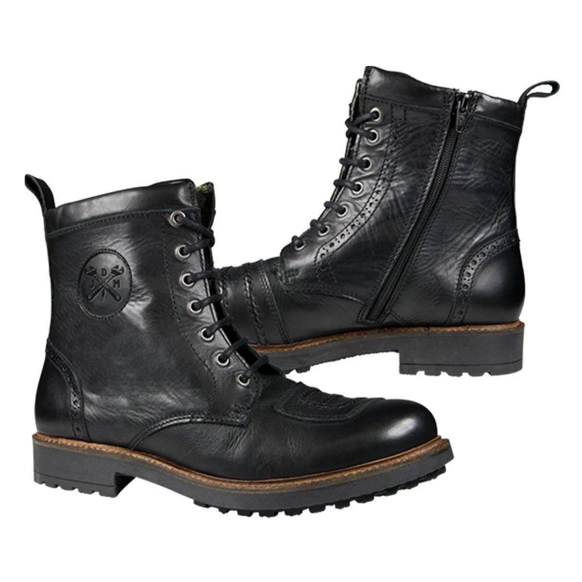 All of our motorcycle shoes of course also have a “waterstop function” (like trekking and hiking shoes), i.e. The tongue is designed to prevent water from quickly seeping into the boot at the laces. The “easy entry” to the boot via zipper allows the rider to quickly and easily put the boot on and take it off without unlacing for added comfort. An oil-resistant, vibration absorbing non-slip sole is also standard on our john doe motorcycle boots. The beautiful vintage leather and details such as a john doe logo embossed in leather on the ankle protection and the JDM metal emblem on the tab round off the classic design of our “falcon”.